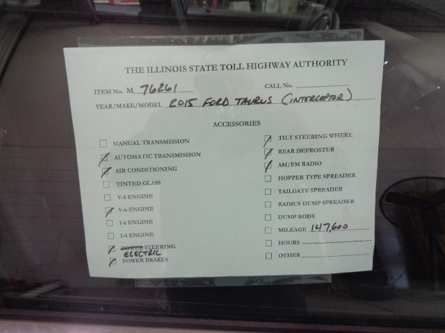 ILLINOIS TOLLWAY 2015 FORD TAURUS, AWD, POLICE INTERCEPTOR, V-6 ENGINE, VEHICLE DAMAGED FROM A FRONT END COLLISION WILL NEED TO BE TOWED UNKNOWN OF ROAD WORTHINESS, FAIR CONDITION, SOME PARTS OR COMPONENTS MAY BE MISSING UNKNOWN IF ENGINE RUNS, BRAKES ARE NOISEY DUE TO RUST FROM SITTING MAY NEED BRAKES, MAY NEED BATTERY , UNKNOWN IF VEHICLE RUNS OR DRIVES . A/C, AM/FM RADIO, AUTO TRANSMISSION, MAY HAVE DENTS, SCRATCHES, PEELING PAINT & RUST NOT PICTURED AND HOLES WHERE EQUIPMENT WAS MOUNTED. . THIS VEHICLE HAS 147,600 MILES . THE ATTACHED PICTURES OR THIS DESCRIPTION MAY NOT INDICATE THE ACTUAL CONDITION OF THIS ITEM.