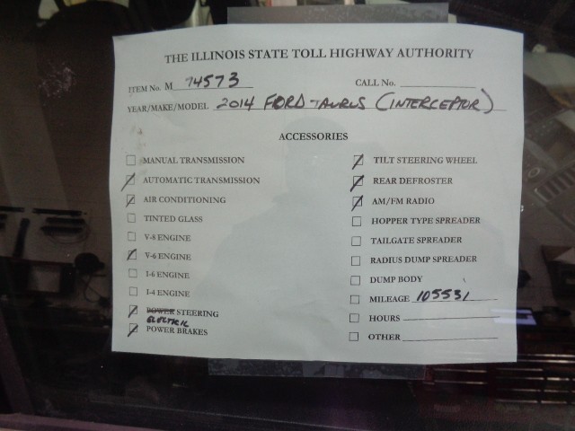 ILLINOIS TOLLWAY 2014 FORD TAURUS, AWD, POLICE INTERCEPTOR, V-6 ENGINE, FAIR CONDITION, VEHICLE WAS HIT IN REAR, BRAKE ROTORS RUSTY FROM SITTING , REAR BRAKES LOCKED UP WILL NEED TO BE TOWED UNKNOWN IF VEHICLE RUNS OR DRIVES HEAVY ACCIDENT DAMAGE MISSING NUMEROUS INTERIOR PIECES SHOULD BE CONSIDERED A PARTS VEHICLE MAY NEED TIRES, HAS RUST SPOTS ON ROOF , HAS REAR END COLLISION DAMAGE. A/C, AM/FM RADIO, AUTO TRANSMISSION, MAY HAVE DENTS, SCRATCHES, PEELING PAINT & RUST NOT PICTURED AND HOLES WHERE EQUIPMENT WAS MOUNTED. . THIS VEHICLE HAS 105,531 MILES . THE ATTACHED PICTURES OR THIS DESCRIPTION MAY NOT INDICATE THE ACTUAL CONDITION OF THIS ITEM.