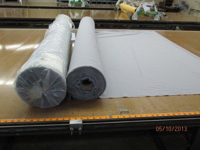 Light Gray material used int he production of clothing. Material is on roll(s).